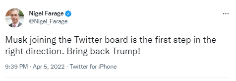 不仅如此,一些外国政客也加入了“让特朗普回来”的呼吁。英国“脱欧党”领袖奈杰尔·法拉奇5日在推特上说,“马斯克加入推特董事会是朝着正确的方向迈出的第一步。让特朗普回来!”↓