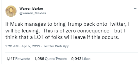 不过,也有不少人不支持恢复特朗普的推特账号。一名特朗普的反对者在推文中表示,“如果马斯克成功地让特朗普重回推特,我就会离开。”他还表示,如果特朗普的账号被解封,很多人都会选择离开推特这一社交媒体平台。截至目前,该条推文已获得9000多次点赞。↓