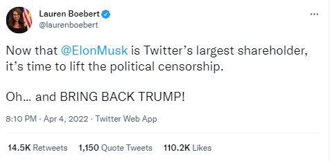 “现在埃隆·马斯克是推特的最大股东了,是时候取消政治审查了。哦......让特朗普回来!”美共和党议员劳伦·贝波特4日在推特上写道。↓