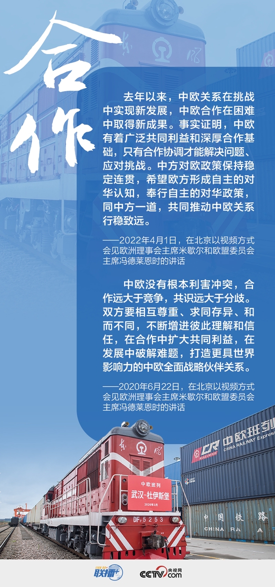 2022年4月1日,习主席在时隔近两年后的这次中欧高峰会晤中,重申中欧四大伙伴关系和中欧全面战略伙伴关系,并鲜明强调,中方的这一愿景至今未改变,当前形势下更有现实意义。