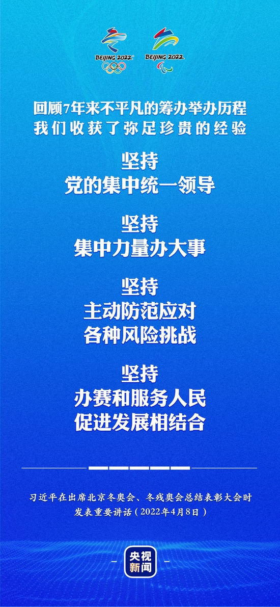 第四,坚持办赛和服务人民、促进发展相结合。北京冬奥会、冬残奥会的成功不仅在于赛事的成功,更在于通过筹办举办冬奥会、冬残奥会带动了各方面建设,为经济社会发展带来了深远的积极影响。我们坚持冬奥成果人民共享,通过推广普及冰雪运动带动全民健身走向纵深,通过产业发展助力脱贫攻坚,通过提升公共服务水平改善人民生活品质,让人民身心更健康、就业更充分、生活更美好,实现共同参与、共同尽力、共同享有。