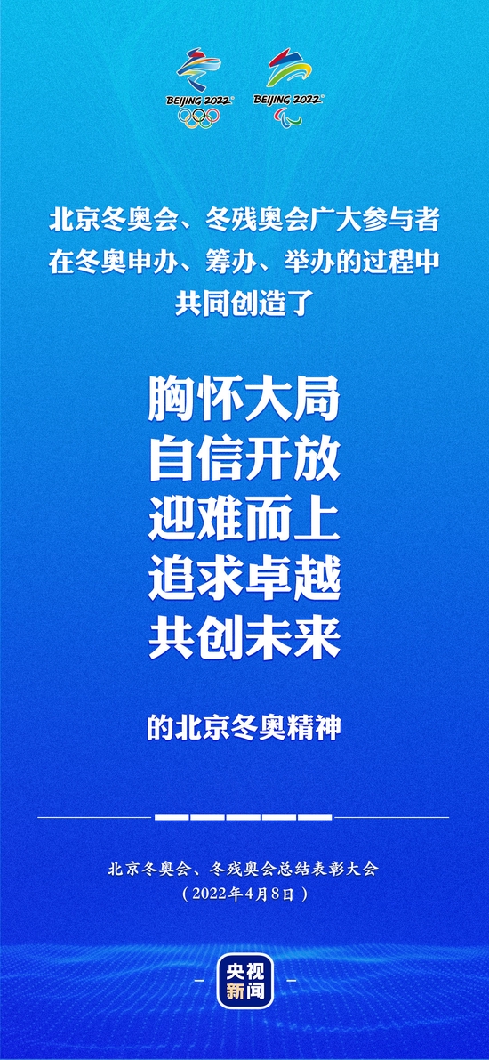 习近平:伟大的事业孕育伟大的精神,伟大的精神推进伟大的事业。北京冬奥会、冬残奥会广大参与者珍惜伟大时代赋予的机遇,在冬奥申办、筹办、举办的过程中,共同创造了北京冬奥精神。这个精神是:胸怀大局、自信开放、迎难而上、追求卓越、共创未来。