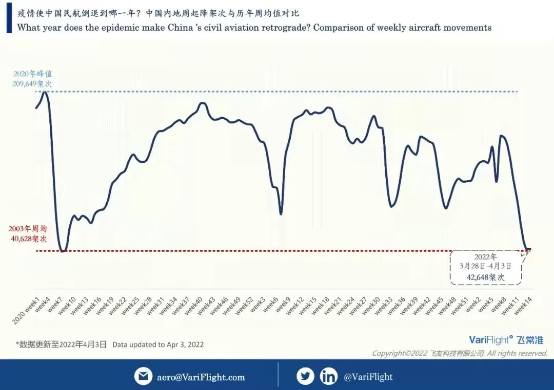而3月28日至4月3日的数据更是显示,当周航班量已降至2003年非典时期的水平。