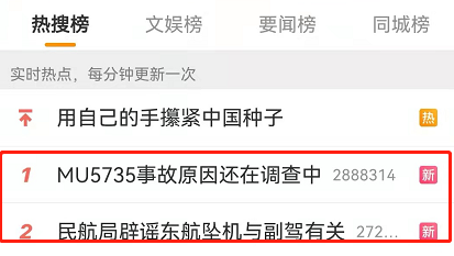 热一:MU5735事故原因还在调查中。热二:民航局辟谣东航坠机与副驾有关。热搜内容基本提炼了今日发布会的关键信息。