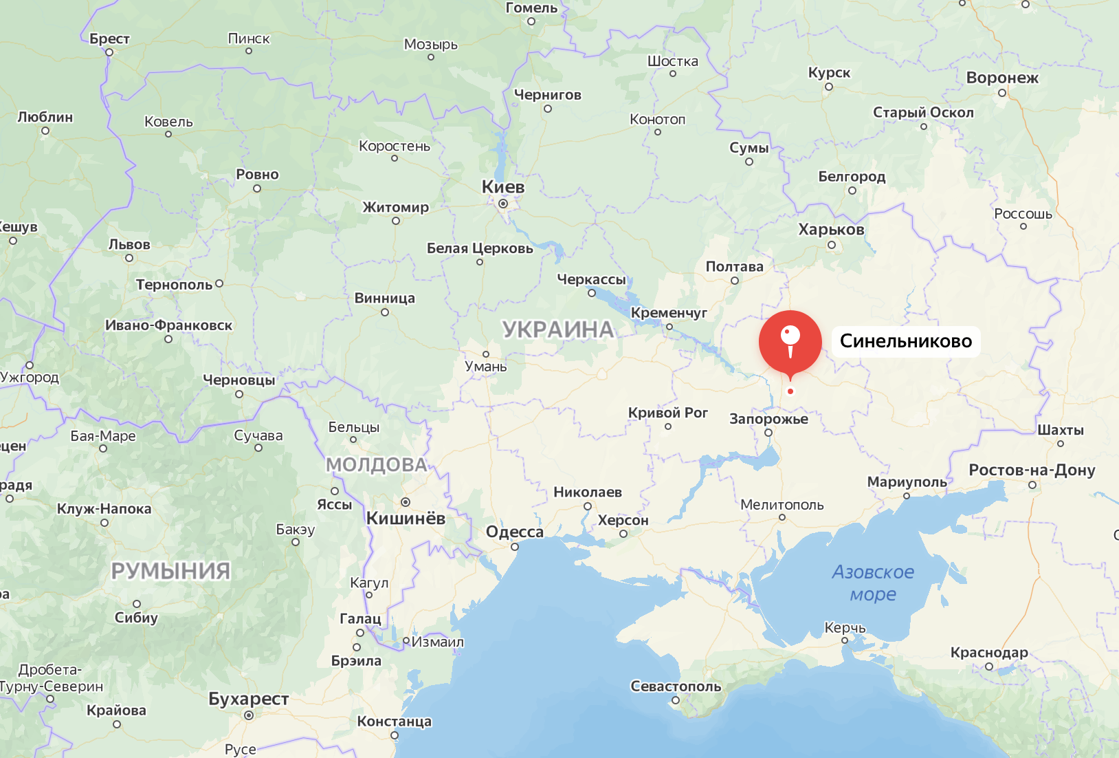 Yandex地图上乌军苏-27被击落的西内尔尼科沃位置示意图,该地距离州首府第聂伯市直线距离不足50公里,但距离基辅则超过了430公里;此前第聂伯市曾报告其机场被多次打击