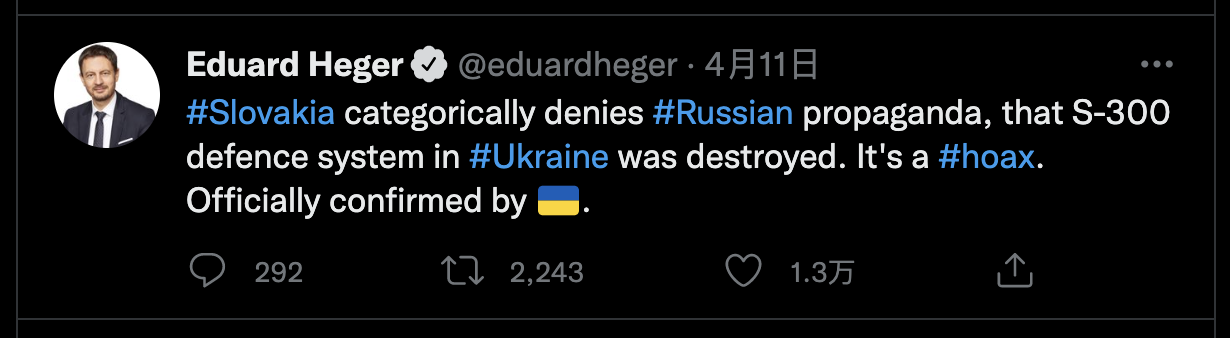 斯洛伐克共和国首相爱德华·黑格尔11日发布推特称,该国断然否认俄罗斯的“宣传”,即乌克兰S-300防空系统被摧毁,黑格尔称这是一个骗局,已经由“乌克兰官方”确认