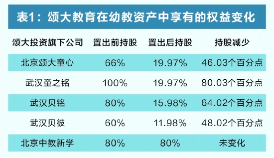 相关资产被转移之后,颂大投资透过武汉华大天童,依然享有部分权益。但资产挪移的一个客观结果是,挂牌公司颂大教育在幼教资产中的利益被侵占了。从前后对比数据来看,颂大教育对应的权益大幅下降(表1)。