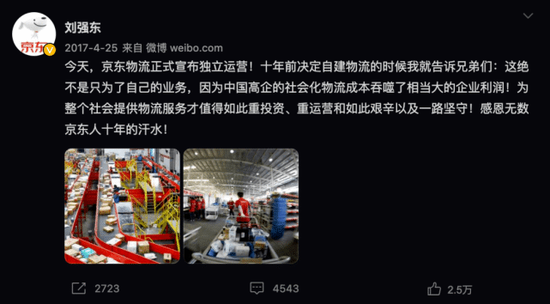 从公司的物流变成物流的公司,京东用了整整十年。2007年,京东创始人刘强东决定自建物流,最主要任务是支持京东商城的业务。2012年正式注册物流公司,2016年11月,京东物流才以独立品牌形象示人,2017年4月25日,京东物流集团正式成立,全面对外开放。