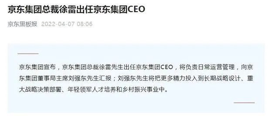 4月6日,阿里巴巴确认蒋凡不再担任淘宝、天猫董事长,仅保留今年1月份就已正式对外公布的阿里海外业务总裁职位;而短短一天后,电商江湖的另一极,京东掌舵人刘强东也在“依依不舍”中正式宣布不再兼任集团CEO一职,由总裁徐雷接棒。