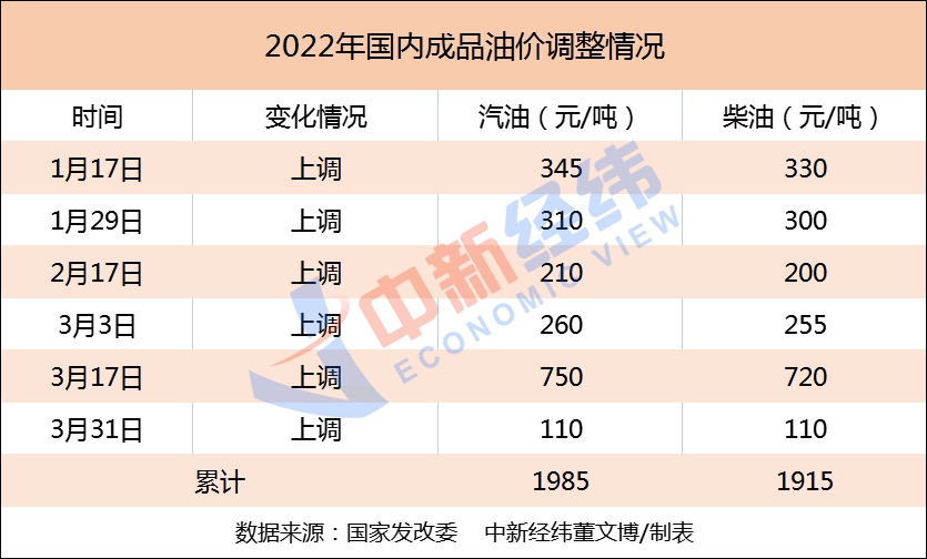 据中新经纬梳理,今年以来,国内成品油价格经历了六轮调整,汽油价格总计上调1985元/吨,柴油价格总计上调1915元/吨,呈现“六涨零跌零搁浅”格局,国内多数地区95号汽油基本迈入“9元时代”。