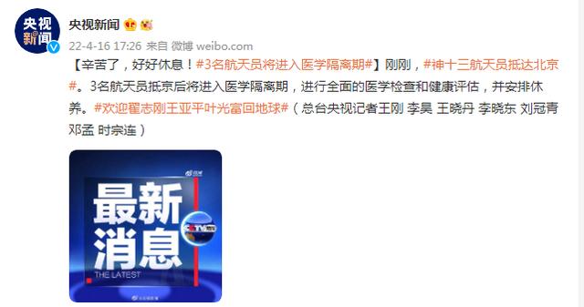 【辛苦了,好好休息!#3名航天员将进入医学隔离期#】刚刚,#神十三航天员抵达北京#。3名航天员抵京后将进入医学隔离期,进行全面的医学检查和健康评估,并安排休养。#欢迎翟志刚王亚平叶光富回地球#(总台央视记者王刚 李昊 王晓丹 李晓东 刘冠青 邓孟 时宗连)