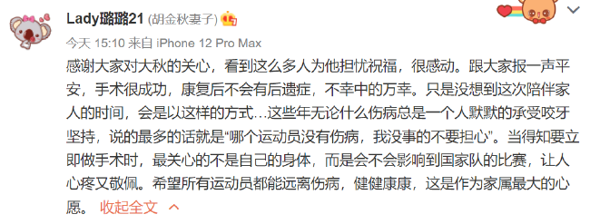 胡金秋的妻子写道:“感谢大家对大秋的关心,看到这么多人为他担忧祝福,很感动。跟大家报一声平安,手术很成功,康复后不会有后遗症,不幸中的万幸。只是没想到这次陪伴家人的时间,会是以这样的方式…这些年无论什么伤病总是一个人默默的承受咬牙坚持,说的最多的话就是‘哪个运动员没有伤病,我没事的不要担心’。当得知要立即做手术时,最关心的不是自己的身体,而是会不会影响到国家队的比赛,让人心疼又敬佩。希望所有运动员都能远离伤病,健健康康,这是作为家属最大的心愿。”