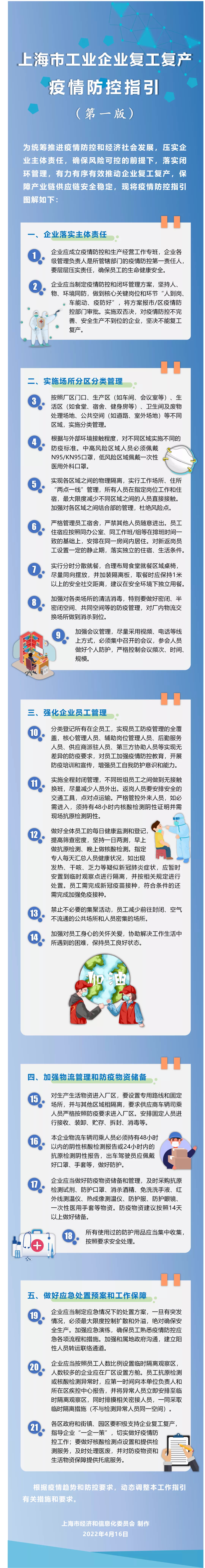4月16日晚,上海市经信委公布了工业企业复工复产疫情防控指引(第一版)(下称“指引”),指引提出五大方面21条措施,保障产业链供应链安全稳定。