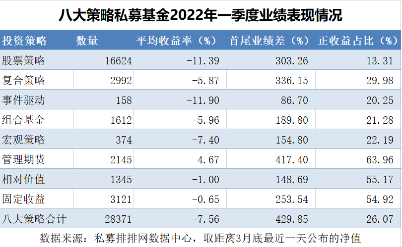私募排排网最新数据显示,今年一季度,纳入统计的28371只私募基金整体收益为-7.56%,亏损私募基金数量占比为74%。其中,股票策略同期平均跌幅更是高达11.39%,亏损私募基金数量占比超过八成,可见今年私募整体业绩在市场震荡中遭遇较大挑战。