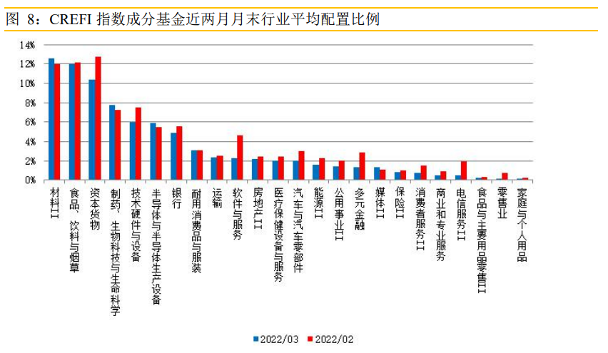 数据显示,3月CREFI指数成分基金持仓增幅最大的三个行业为材料,制药、生物科技与生命科学,以及半导体与半导体生产设备,持仓增幅分别为0.56%、0.47%和0.42%;减幅最大的三个行业为软件与服务、资本货物、技术硬件与设备,减仓幅度分别为2.33%、2.32%和1.55%。