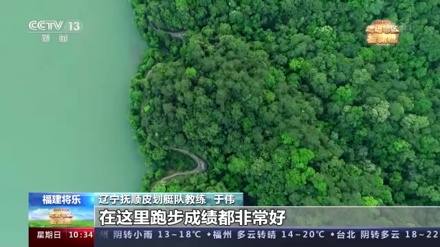 辽宁抚顺皮划艇队教练 于伟:这里的水有两三米深,都能看到底,水非常清。这四周的山都是油绿油绿的。森林覆盖率大,我们亲身体验,在这里跑步成绩都非常好。当地人养成了一个习惯,对这一山一水一草一木都像自己家里的似的,都非常爱护。