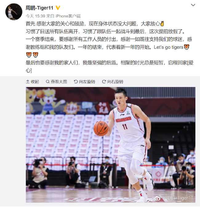 一个赛季结束,要感谢所有工作人员的付出,感谢一如既往支持我们的球迷,感谢教练组和我的队友们。一年的结束,代表着新一年的开始。Let’s go tigers????????????