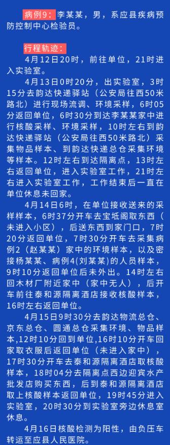 据此前报道,4月16日,应县对疾控中心工作人员进行核酸检测时,发现1人阳性,随后确诊。病例9李某某,是县疾病预防控制中心的检验员。