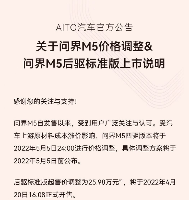 新浪科技讯 4月20日上午消息,AITO汽车官方发布关于问界M5价格调整&问界M5后驱标准版上市说明公告,称受汽车上游原材料成本涨价影响,问界M5四驱版本将于2022年5月5日24:00进行价格调整,具体调整方案将于2022年5月5日前公布。