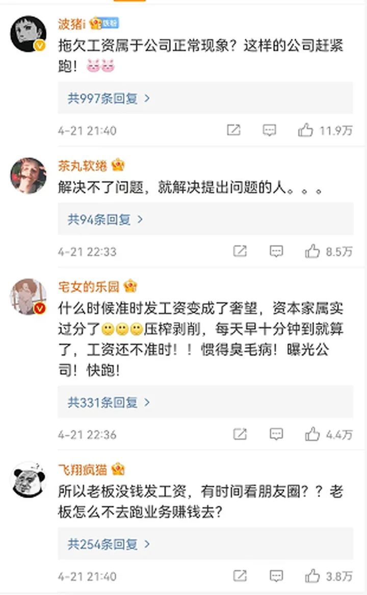 对此,有网友吐槽:“这太恶劣了吧,不反省自己不能给员工按时发工资还把人给开了”、“拖欠工资是公司正常现象?”
