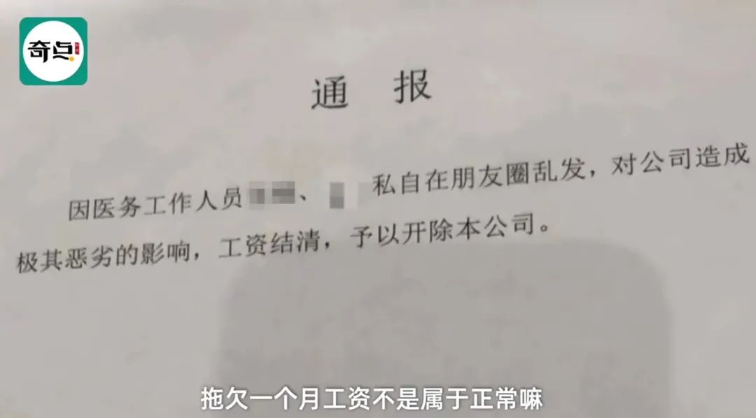 据康宁医养中心开除通报内容显示:两名医务工作人员私自在朋友圈乱发,对公司造成极其恶劣的影响,工资结清,予以开除。