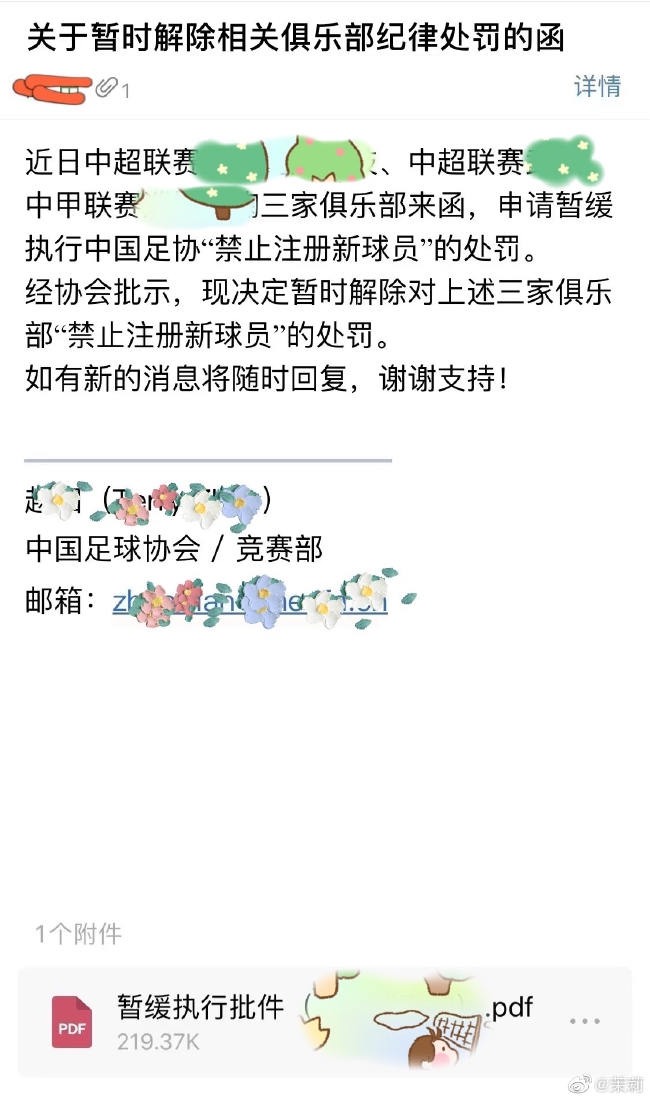近日记者程文莉在个人微博上晒出了邮件截图,该截图显示中国足协暂时解除了三家俱乐部“禁止注册新球员”的处罚,但这其中有一家俱乐部已欠薪两年。