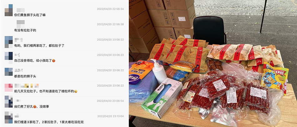 夏女士介绍,4月13日开始,小区陆续发放新一批物资,包括蔬菜、预包装食品、医用口罩等。20日,有居民在群里询问是否有人吃完狮子头后拉肚子,随后陆续有居民回复,“我们楼两家吃了,都拉肚子了”,“我们楼道3家吃了,2家拉肚子,1家太难吃没吃完”。