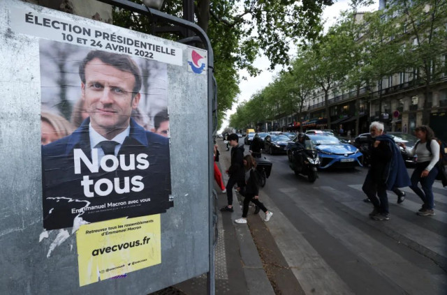 当地时间2022年4月24日,法国巴黎,法国总统选举第二轮投票开始,当地选民纷纷前往投票站参加投票,图为街头张贴的法国总统马克龙竞选海报。图/IC photo