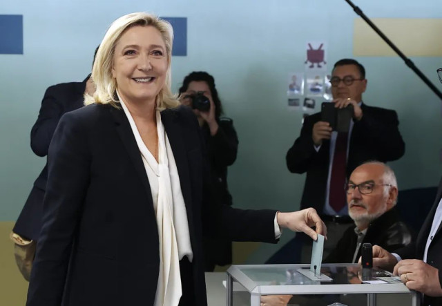 当地时间2022年4月24日,法国加莱海峡省埃南博蒙,法国总统大选极右翼候选人玛丽娜·勒庞现身当地一家投票站,参加大选第二轮投票。图/IC photo