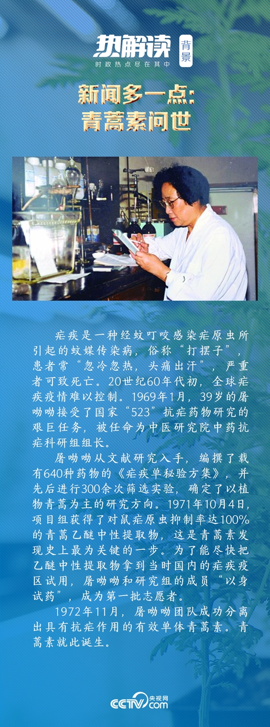 2015年10月,屠呦呦因“从中医药古典文献中获取灵感,先驱性地发现青蒿素,开创疟疾治疗新方法”,获得诺贝尔生理学或医学奖。