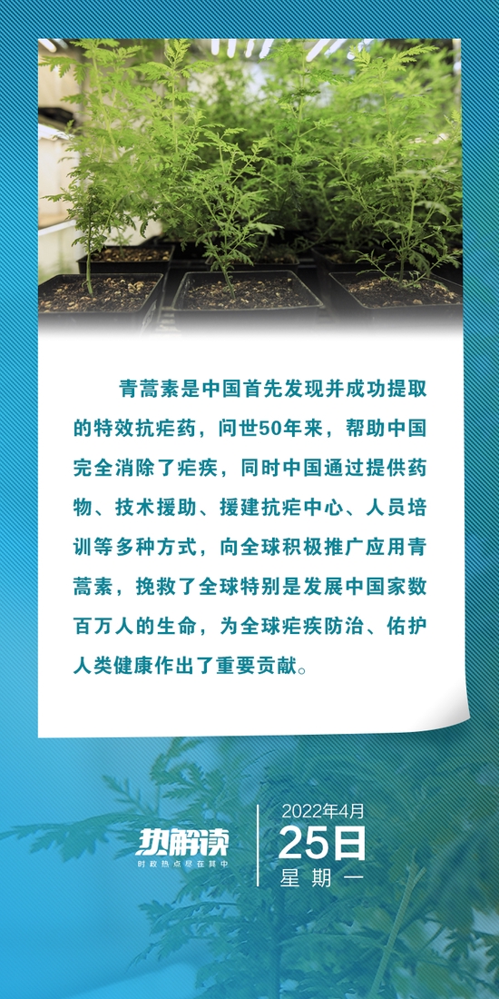 4月25日是“世界防治疟疾日”。习近平主席向青蒿素问世50周年暨助力共建人类卫生健康共同体国际论坛致贺信。
