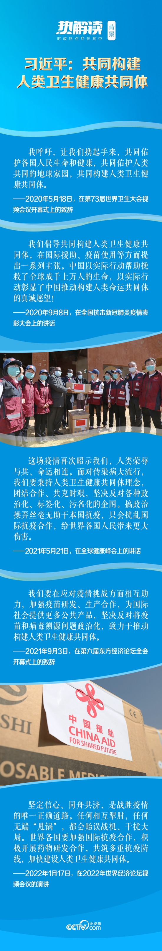 2020年3月,在致法国总统马克龙的慰问电中,习近平主席首次提出了“人类卫生健康共同体”理念。此后,习主席多次在国际国内重大场合重申这一理念。