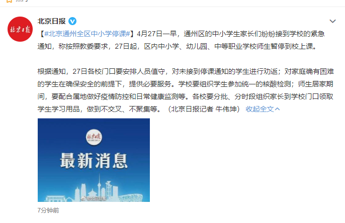 4月27日一早,北京通州区的中小学生家长们纷纷接到学校的紧急通知,称按照教委要求,27日起,区内中小学、幼儿园、中等职业学校师生暂停到校上课。