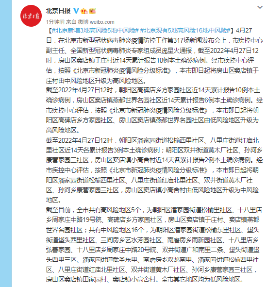 截至2022年4月27日12时,朝阳区潘家园街道松榆西里社区、八里庄街道红庙北里社区近14天各累计报告3例本土确诊病例;朝阳区双井街道黄木厂社区、孙河乡康营家园三社区,房山区窦店镇小高舍村近14天各累计报告2例本土确诊病例。经市疾控中心评估,按照《北京市新冠肺炎疫情风险分级标准》,本市即日起将朝阳区潘家园街道松榆西里社区、八里庄街道红庙北里社区、双井街道黄木厂社区、孙河乡康营家园三社区,房山区窦店镇小高舍村由低风险地区升级为中风险地区。