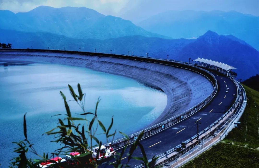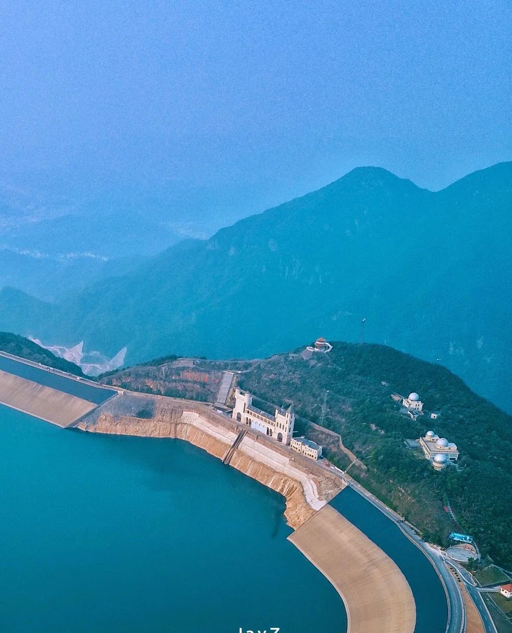 站在高台之上观看,山峦与水库相互映衬,美景尽收眼底。