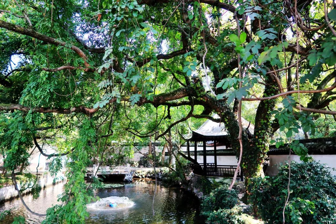 一边是翘角飞檐,一边是老人们咿呀戏曲,公园里的人不少,但一点不觉得喧闹,在亭子里坐坐,都特别舒服。