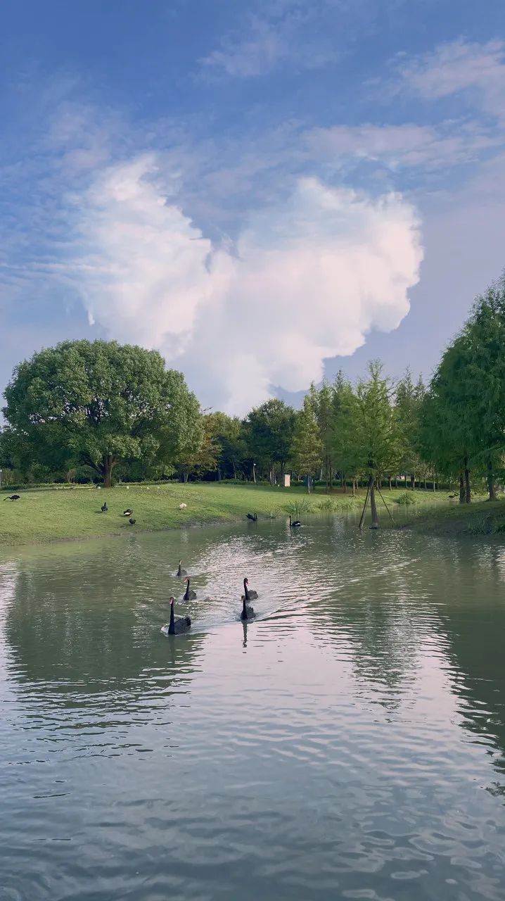 公园里有亭子、森林,草丛,湖面上时不时能看到嬉戏的黑天鹅,幸运的,还能看到散步的野生小鹿。