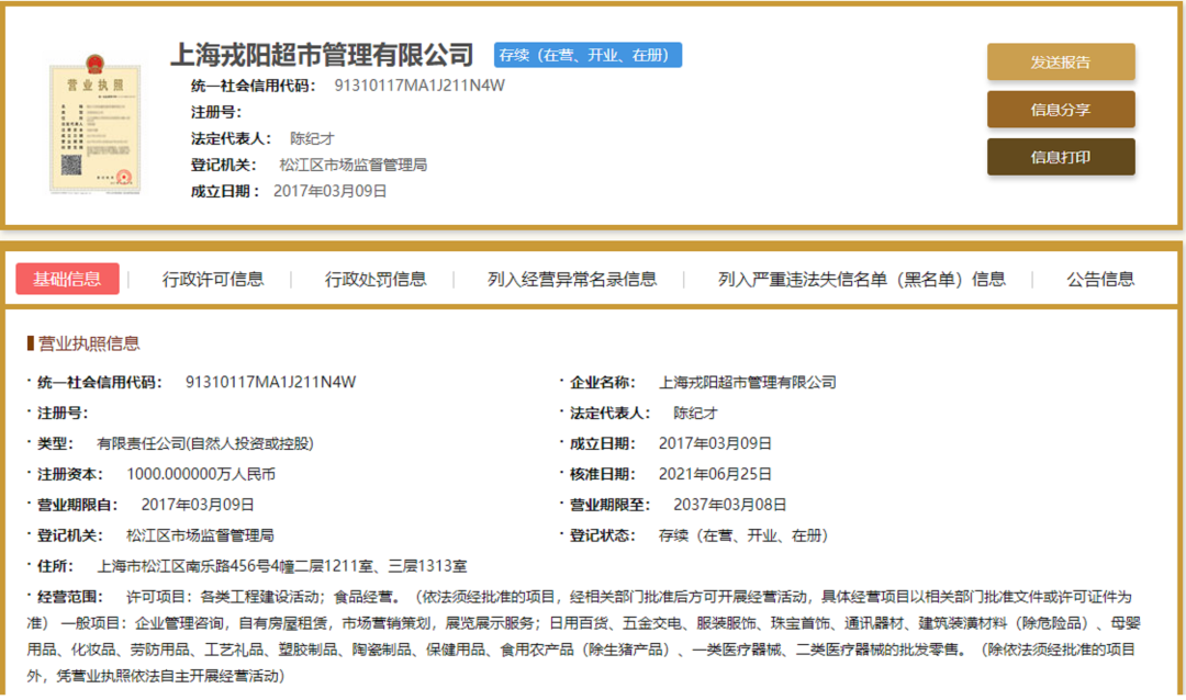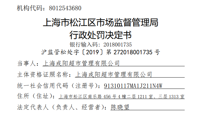 国家企业信用信息公示系统显示,2019年6月3日,因擅自使用与他人有一定影响的商品名称、包装、装潢等相同或者近似的标识,上海戎阳超市管理有限公司曾被上海市松江区市场监管局作出责令停止违法行为,罚款5万元的行政处罚决定。