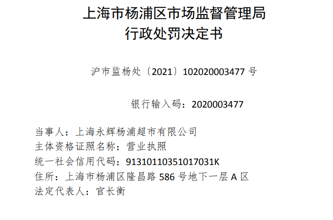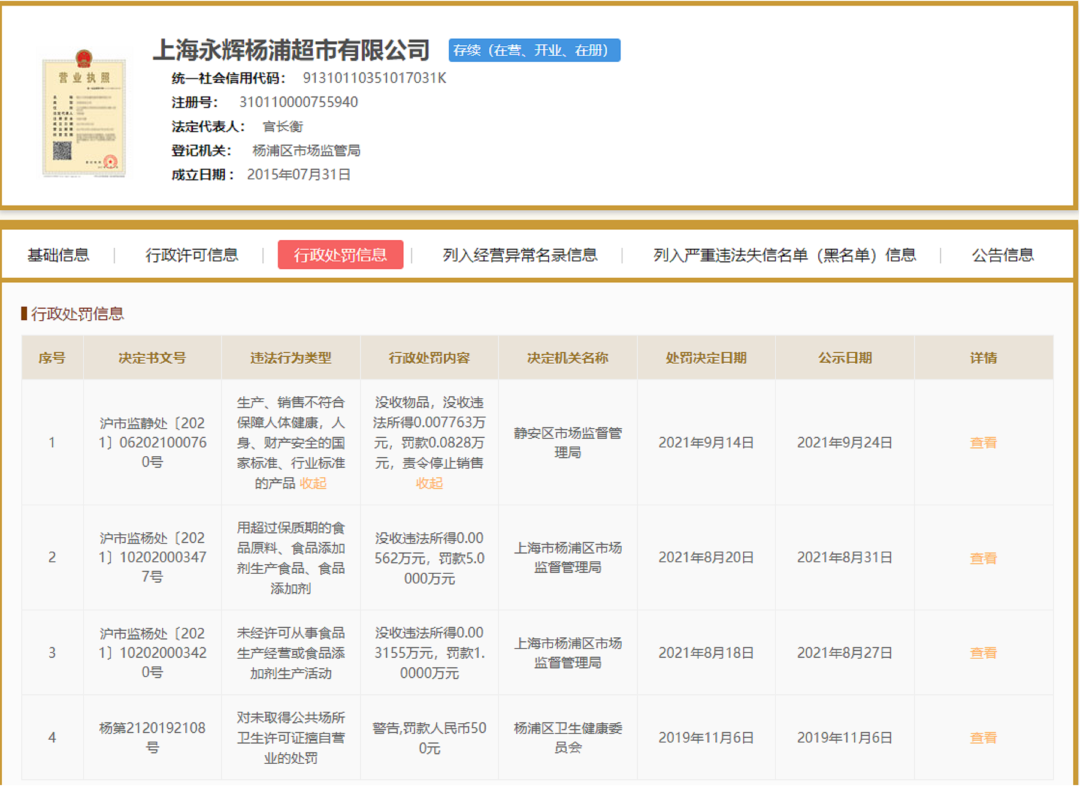 国家企业信用信息公示系统显示,仅去年,上海永辉杨浦超市有限公司就被上海各级市场监管部门作出3次行政处罚决定,其违法行为涉及:生产、销售不符合保障人体健康,人身、财产安全的国家标准、行业标准的产品;用超过保质期的食品原料生产食品;未经许可从事食品生产经营活动。