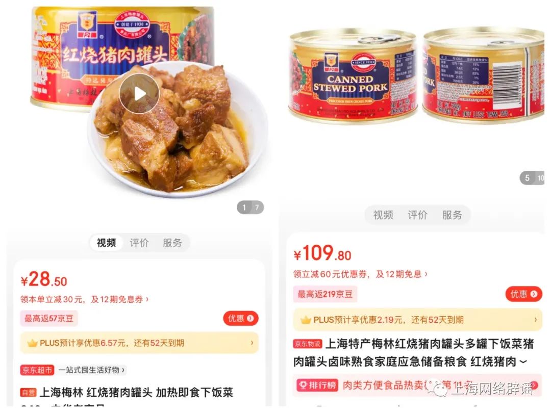 有静安区网友在社交平台发帖称,政府发放的保供物资里有狗粮,对此感到不满意。上海辟谣平台通过天猫、京东等主流购物平台搜索核查,发现该罐头实际是上海梅林牌的“红烧猪肉罐头”卤味熟食产品。
