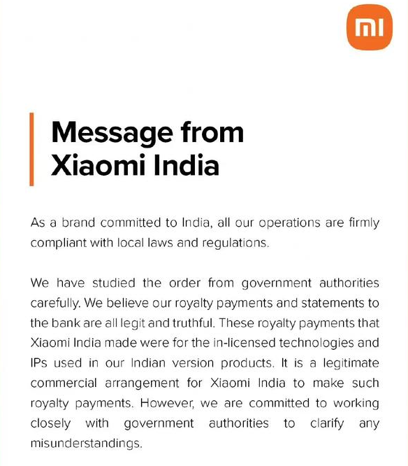 小米印度公司向银行支付的特许权使用费和账单合法且真实,所支付版税均用于公司印度版本产品所使用的授权技术和知识产权,是合法的商业行为。小米表示,将与政府保持密切合作,以澄清任何误会。