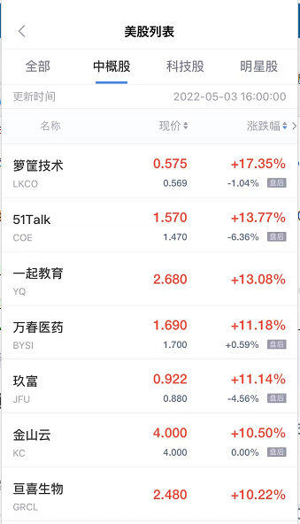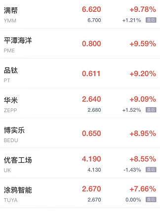 51Talk、一起教育涨超13%,玖富、金山云涨超10%,满帮涨超9%,涂鸦智能 、猎豹移动、知乎涨超7%,高途、九洲大药房涨超6%,腾讯音乐、达达集团、乐居、网易有道、新氧、阿里巴巴、百济神州、涨超4%,富途控股、兰亭集势、爱奇艺、拼多多、虎牙、唯品会、云米科技、1药网涨超3%,百度、第九城市、京东、欢聚集团、新东方、嘉楠科技、贝壳、荔枝、中通、老虎证券涨超2%,汽车之家、人人公司、中石油、云集、斗鱼、逸仙电商、叮咚买菜、搜狐、迅雷、开心汽车、掌门教育涨超1%,雾芯科技涨近1%。