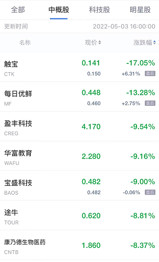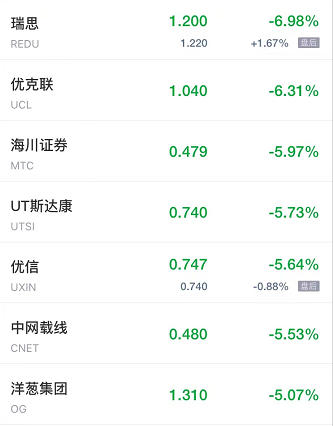 每日优鲜跌超13%,途牛跌超8%,瑞思、趣活跌超6%,寺库、洋葱集团跌超5%,洪恩、蘑菇街跌超4%,库客音乐、红黄蓝跌超3%,尚德机构跌超2%,网易、小牛电动跌超1%,趣头条跌近1%。