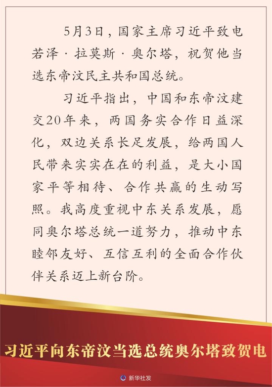 新华社北京5月3日电 5月3日,国家主席习近平致电若泽·拉莫斯·奥尔塔,祝贺他当选东帝汶民主共和国总统。