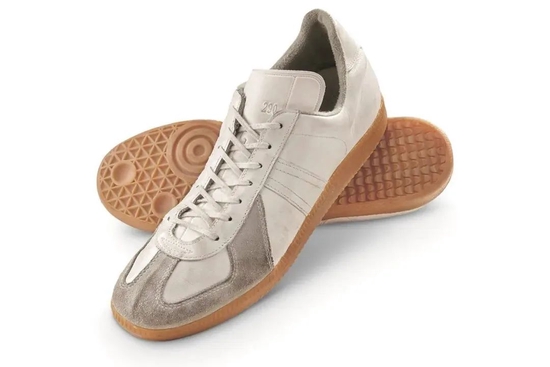 真皮鞋面搭配橡胶鞋底的外观让它在当年深受德军喜爱,从而改良成军方训练球鞋。