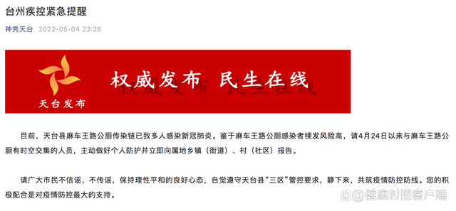 5月4日晚,浙江天台官方微信号“神秀天台”发布消息称,浙江台州市疾控中心紧急提醒,目前台州天台县麻车王路公厕传染链已致多人感染新冠肺炎。鉴于麻车王路公厕感染者续发风险高,请4月24日以来与麻车王路公厕有时空交集的人员,主动做好个人防护并立即向属地乡镇(街道)、村(社区)报告。