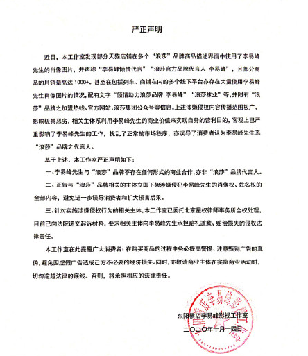 浪莎和李易峰的纠纷始于2020年。早在2020年10月,李易峰工作室曾对多个“浪莎”品牌商品描述界面使用李易峰肖像图片发布严正声明,称李易峰与“浪莎”品牌无任何商业合作,并针对涉嫌侵权行为的相关主体提起诉讼。要求相关主体向李易峰道歉、赔偿损失。