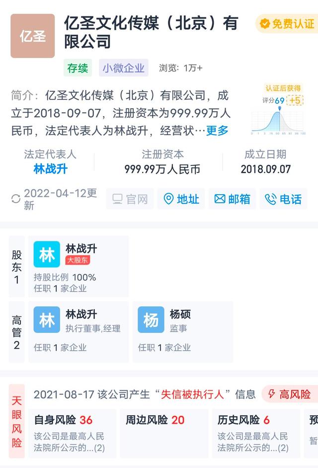红星新闻记者注意到,天眼查显示,亿圣自身存在多个风险,是最高人民法院所公示的失信公司,并被限制高消费,其法定代表人林战升也是失信被执行人并被限高。此外,终本案件显示,林战升被执行标的总金额达到2915522万元,未履行总金额为2912964万。