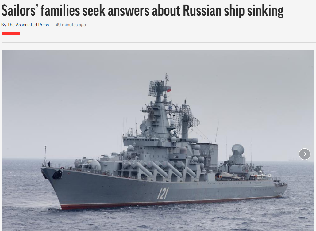“俄罗斯军方用了一周多的时间才承认,在其一艘旗舰巡洋舰在黑海沉没后,一名军人死亡,另外20多人失踪”,美联社说,俄军的这则声明发生在失踪士兵的家人开始拼命寻找他们的儿子之后,那些亲属们对俄军最初声明所说的、“所有船员都被撤离”的说法提出了尖锐的质疑。