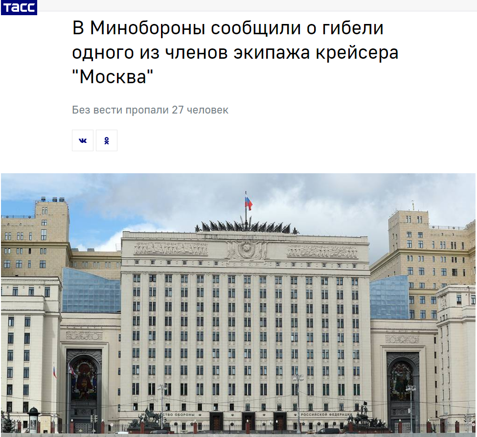 俄罗斯国防部在一份通稿中说:“ 4 月 13 日火灾的结果是,‘莫斯科’号导弹巡洋舰因弹药爆炸而严重受损。船员试图扑灭大火没有成功。在挽救巡洋舰的过程中,一名军人牺牲,另有27名船员失踪。剩余的396名船员从巡洋舰上撤离到正处于该区域的黑海舰队船只上,并被送往塞瓦斯托波尔。”